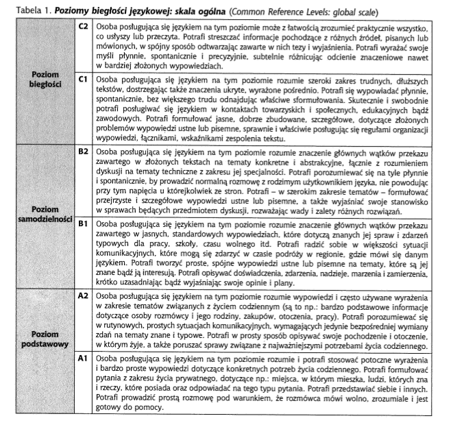 Poniżej znajdziesz tabelkę ilustrujacą poziomy biegłości językowej w skali ogólnej według ESOKJ : Europejski system opisu kształcenia językowego : uczenie się, nauczanie, ocenianie (2003 :33).